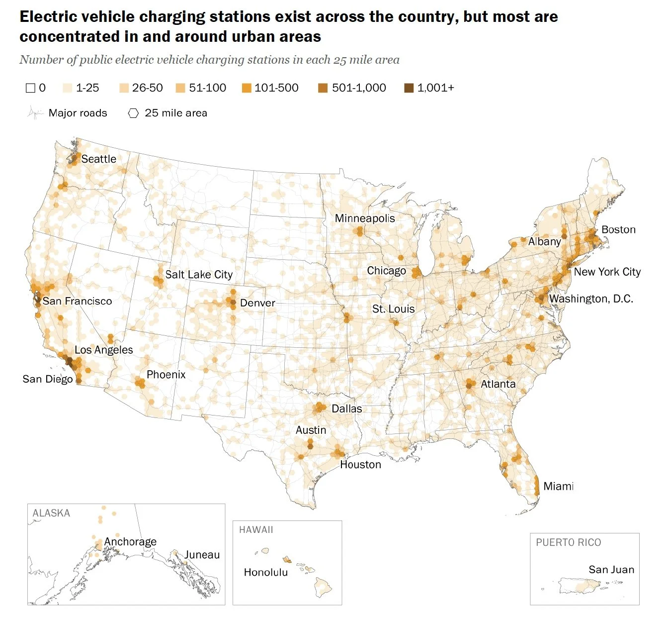 Urban areas fare better: 60% of urban Americans live within a mile of a charger. But only 17% of rural residents can say the same (Pew, 2024). California leads with the highest concentration of chargers but now grapples with congestion: one public charger serves roughly 29 EVs, one of the worst ratios in the nation.