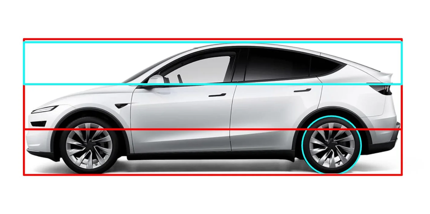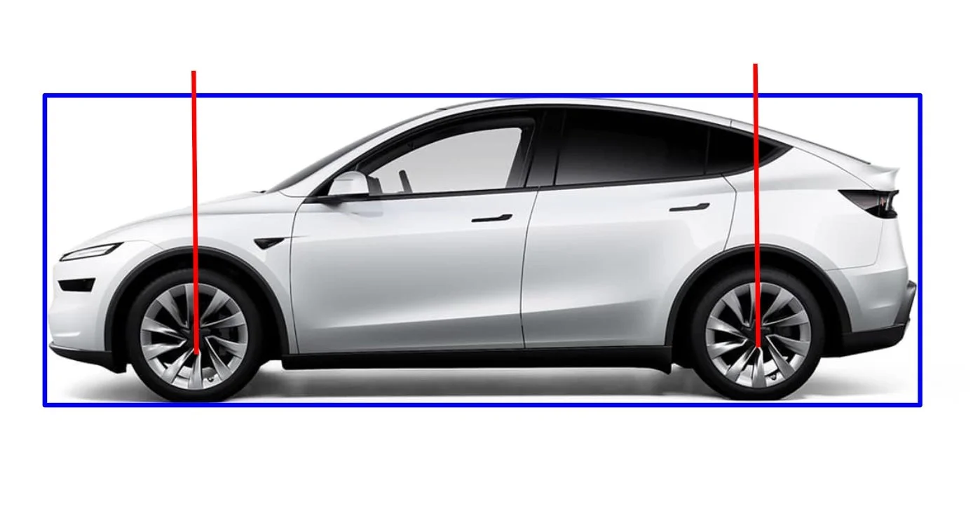 Lower is sportier. Around 2.1x - 2.4x feels planted for coupes/GTs; 2.6x - 3.0x is common in crossovers. The Y isn’t cartoonish, but it’s clearly taller per unit of wheel, so the body reads heavier even before you clock anything else. This is why upsized wheels rarely “fix” a tall crossover: the body is still winning the vertical argument.