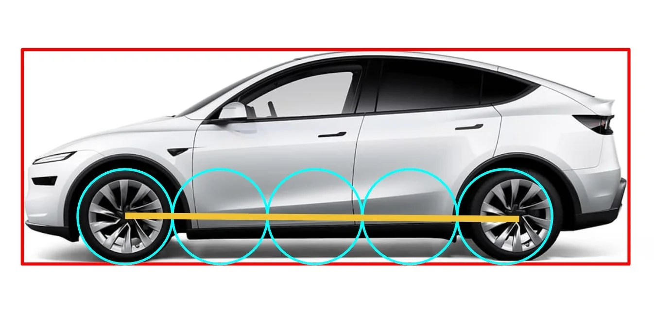Model Y: modern EV packaging + pedestrian-impact geometry push the A-pillar forward of the axle and the C-pillar behind the rear axle. The cabin overshoots at both ends, so the car looks like it’s wearing its body outside the wheelbase box. That alone makes it feel bloated, even though some raw dimensions are similar.