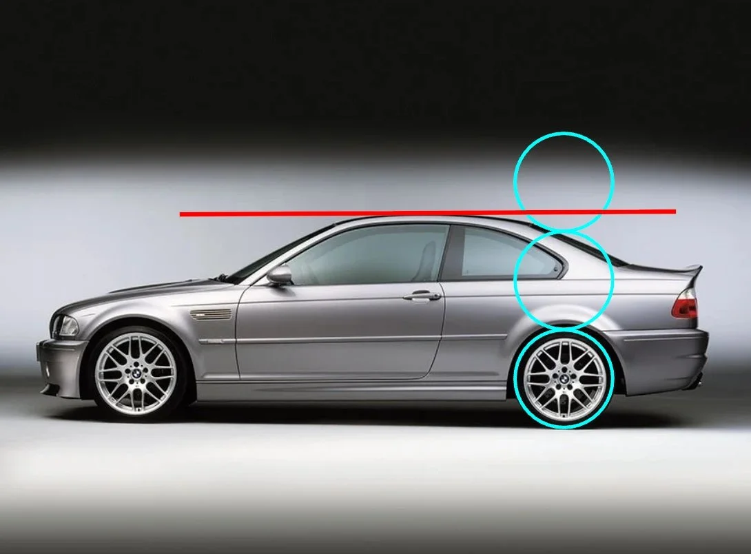 E46 M3: textbook. The A-pillar makes a B-line for the axel giving a long dash-to-axle gives a premium nose; C-pillar kicks off over the rear axle so the coupe’s mass sits inside the wheelbase. Your eye reads “front-mid engine, agile, ready.”